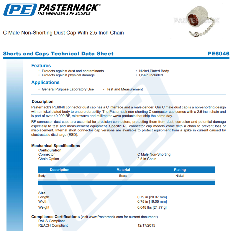 > Pasternack 防塵蓋 PE6046拍前請聯(lián)系店家確認(rèn)下實(shí)際庫存量以及實(shí)時(shí)報(bào)價(jià),未確認(rèn)庫存前請慎拍,以免庫存不足給您造成不必要的困擾。同品牌下有多種型號(hào),詳情請咨詢客服。